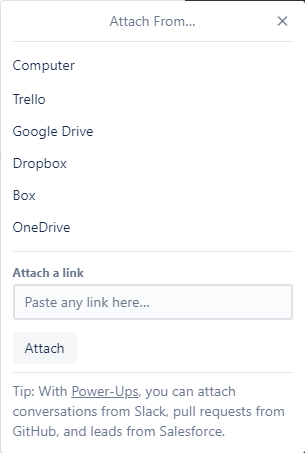 Trello works smartly with all sorts of attachments as well. I can upload something directly from my computer (up to 10 MB for free and 250 MB with a paid subscription), however, I can also link files from storage services like Dropbox, Google Drive, Box, and OneDrive, and then a link. Personally, I only use Dropbox and Drive so I’ll stick to talking about them. When you attach a file from Dropbox or Drive Trello is smart enough to get the link to your file and store that instead of the actual file. Why is this go great? Well, I can link a Photoshop file named “AwesomeCombatPicture.psd” (stored in Dropbox) to several cards and they all refer to the same file. So I can edit the PSD file, save the changes and since Trello saved just the link to the Dropbox file and not the file directly I don’t have to do anything else.